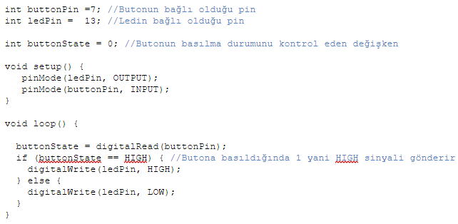Butona basıldığında led’in yanmasını ve butona basılmadığında led sönmesini sağlayacak kodları yazalım.
