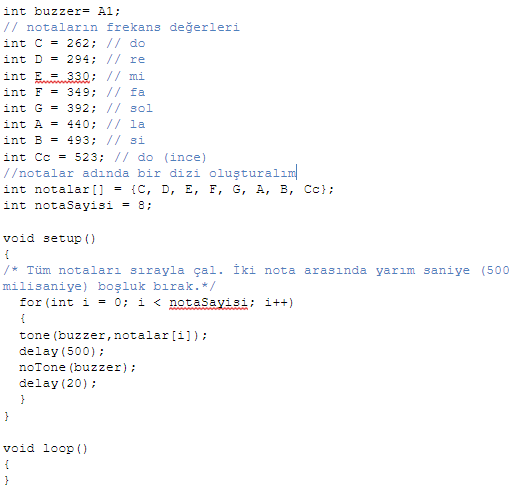 tone(buzzer pin numarası, nota değeri); ses elde etmek için kullanılacak koddur.