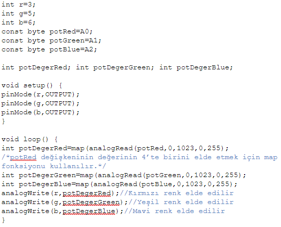 3 ayrı potun ürettiği değerlere göre RGB Led üzerinde renk elde çalışması yapalım.