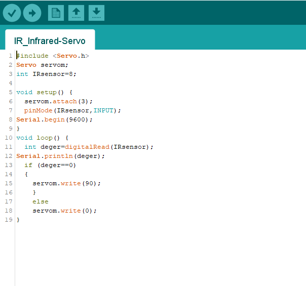 Ir sensörünün önüne engel geldiğinde servo motorun açısı 90 derece değişecek, engel gidince 0 derece konumuna gelmesini sağlayacak kodları yazalım.