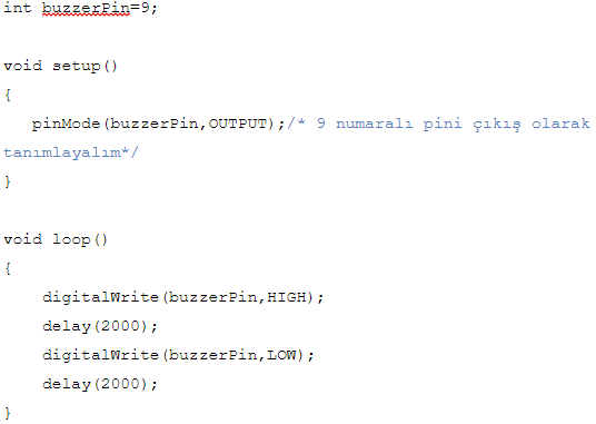 2000 ms aralıklarla buzzer'ın ses çıkarmasını sağlayacak kodları yazalım.
