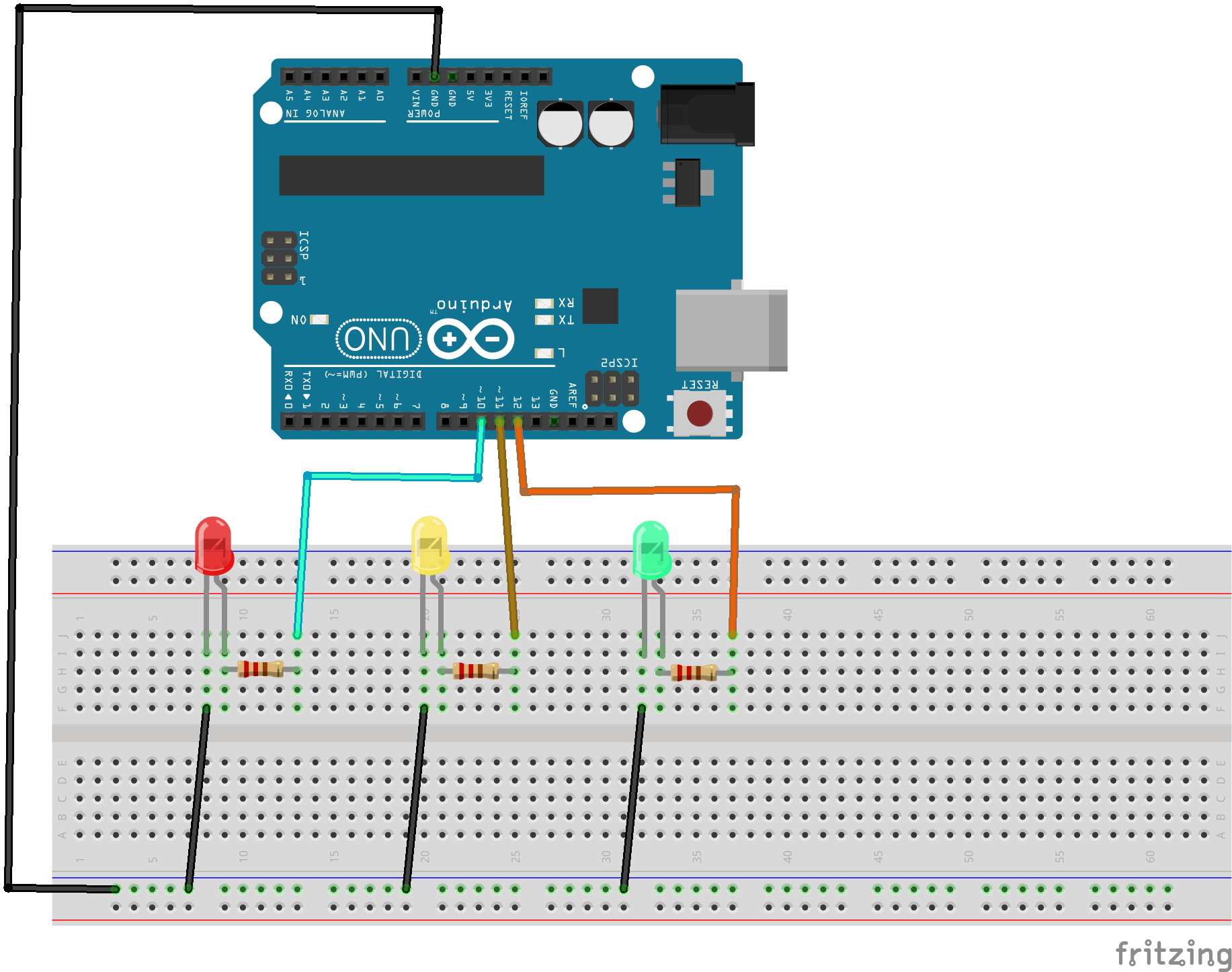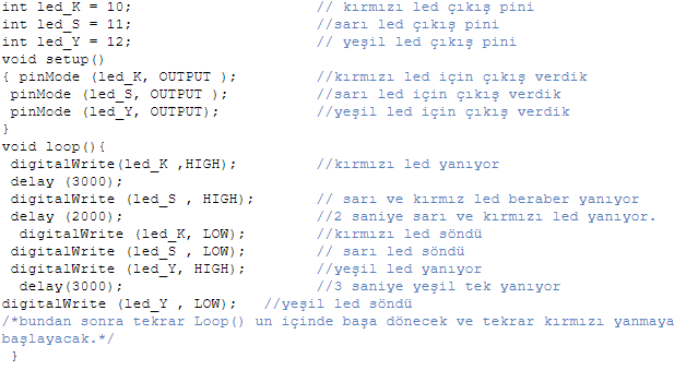 Işıkların yanma süreleri; kırmızı led 3 sn, sarı led 2 sn, yeşil led 3 sn olacak şekilde Arduino kodlarını yazalım.