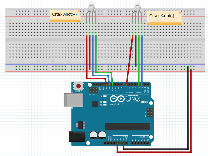 RGB Led, ortak Anot ise anot bacağı breadborad üzerindeki kırmızı kanala, ortak katot ise katot bacağı breadboard üzerindeki mavi kanala bağlanır.