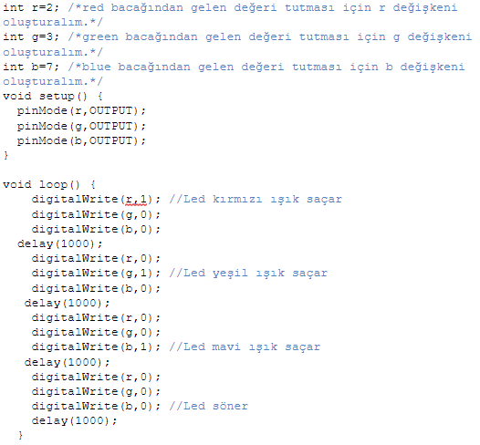 1 saniye aralıklarla RGB Led üzerindeki renklerin yanıp sönmesini sağlayacak kodları yazalım.
