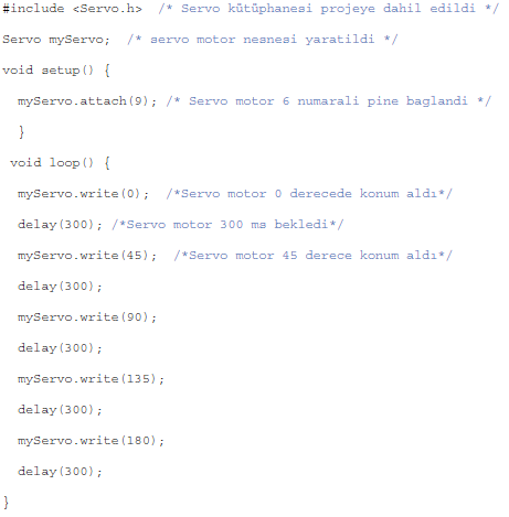 300 ms zaman aralığıyla servo motorun açısını 0 dereceden 180 dereceye 45’er derece değiştirere çalışacak kodları yazalım.