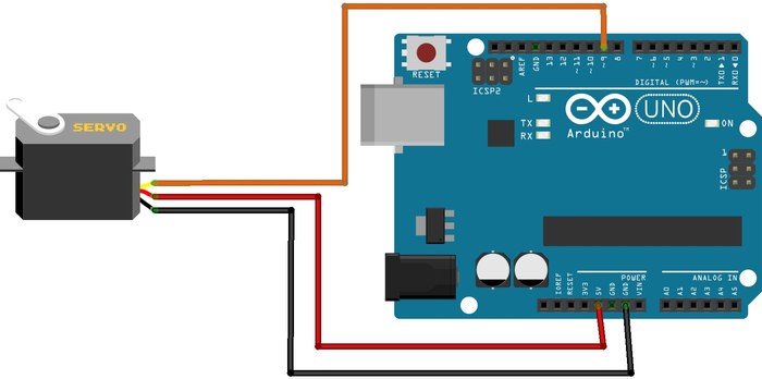 Servo motorun turuncu bacağından çıkan kabloyu Arduino kartın 9 numaralı dijital pinine bağlayalım.