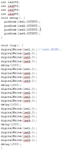 Ardından da 4 led birden yanacak ve 1 sn sonra hepsi sönüp tekrar aynı şekilde yanmaya başlayacak devremizin kodlarını yazalım.