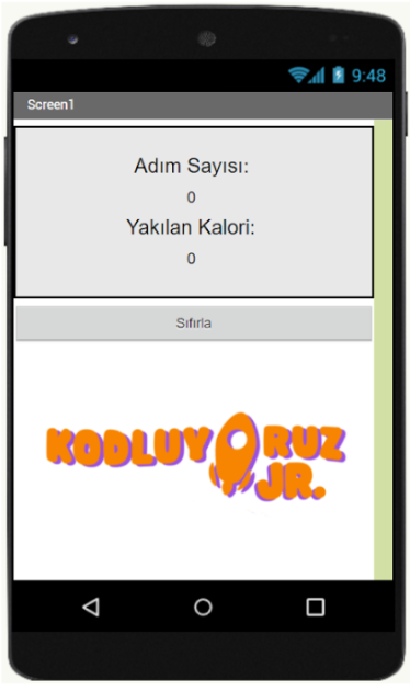 Sensör her adım algıladığında ekranda adımı 1, kaloriyi de 0.05 arttırmak için aşağıdaki kod eklenir.