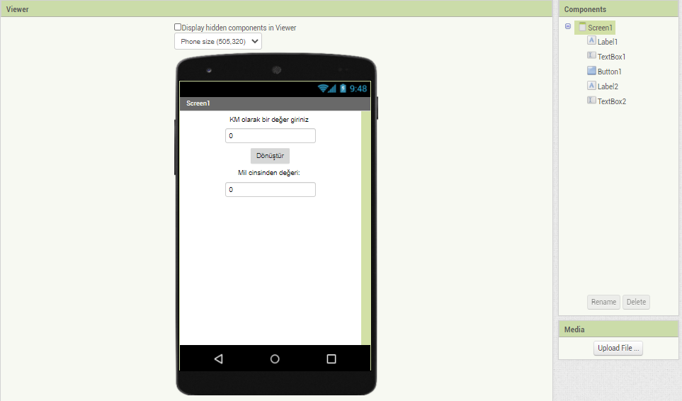 Bu tasarımı oluşturmak için gerekli olan App Inventor araçları; 2 x Label, 2 x Textbox, 1 x Button.