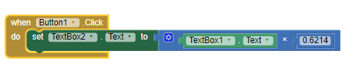 Çarpma bloğunun sol kutucuğu içerisine Texbox1.text bloğunu sağ kutucuğa ise 0.6214 sabit sayısını yazalım.