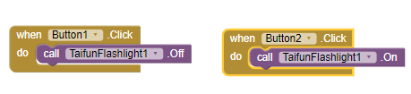 Blocks bölümünden “TaifunFlashlight1” seçelim ve açılan ekrandan “call TaifunFlashlight. Off” ve “call TaifunFlashlight. on” bloklarını alalım ve .click bloğunun içerisine yerleştirelim.