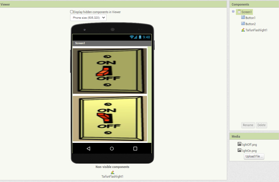 Bu tasarımı oluşturmak için gerekli olan App Inventor araçları; 2 x Buton, 2 x Aç-Kapat görseli.