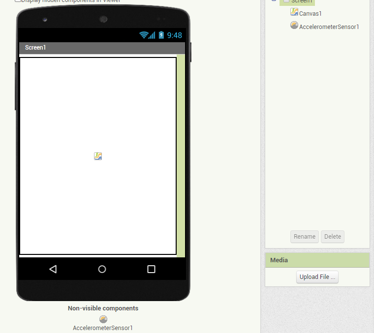 Bu tasarımı oluşturmak için gerekli olan App Inventor araçları; 1 x Canvas, 1 x Accelerometer.