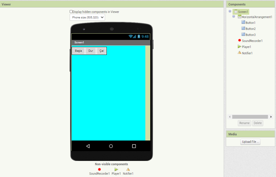 Bu tasarımı oluşturmak için gerekli olan App Inventor araçları; 3 x button, 1 x HorizontalArrangement, 1 x SoundRecorder, 1 x Player, 1 x Notifier.