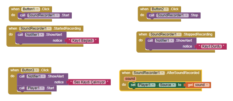 Bunun için Blocks bölümünden SoundRecorder1 aracını seçelim ve açılan pencereden “when SoundRecorder1.AfterSoundRecorded do” ve “when SoundRecorder1.StopRecording do” bloklarını alalım.