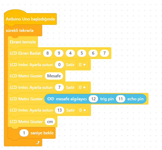 Lcd metni göster bloğunu alalım ve metin alanına da mesafe sensörünün değerini göstermek istediğimiz için mesafe algılayıcı 12 trig pin 11 echo pin bloğunu alalım.