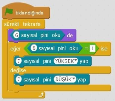 Butona basılıp basılmadığını öğrenmek için Görünüm dizisinden “Merhaba de” bloğunu alalım ardından Robotlar dizisinden “..sayısal pini oku” bloğunu alalım ve merhaba yazısının yerine yerleştirelim.