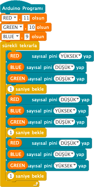 Ardından “9 sayısal pini yüksek yap” bu bloktaki 9 sayısını silip ledlerin bağlı olduğu pin numaralarını temsil eden değişken bloklarını yerleştirelim.