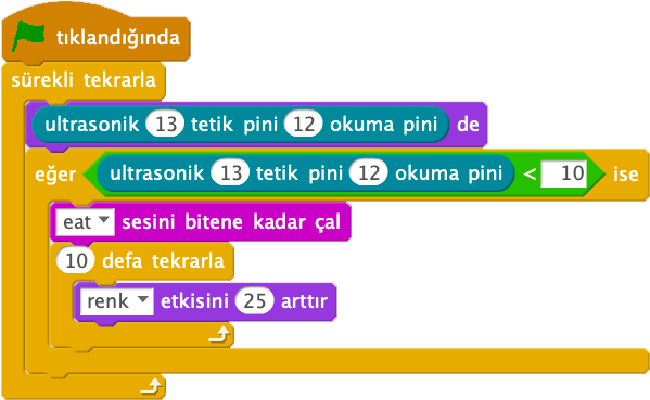 5. Sonuç olarak “Yeşil Bayrak tıklandığında” sensörün ürettiği değer 10’dan küçük olduğunda kukla “eat” sesi çıkartacak ve 10 defa kukla renk değiştirecek kod bloklarını çalıştıralım.
