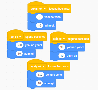 “Hareket” dizisinde bulunan “90 yönüne yönel” bloğunu herbir yön bloğunun altına koyalım.