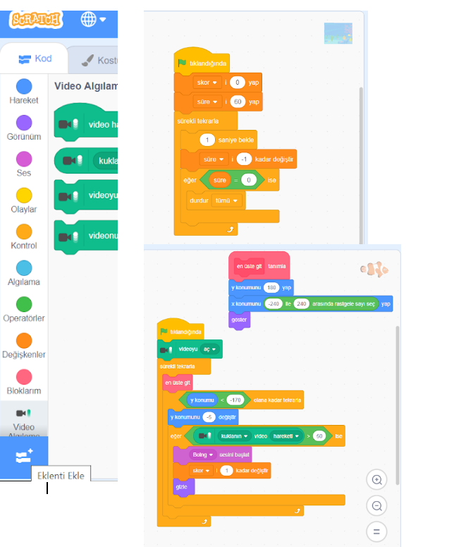 “Kedi” kuklasının üzerinde bulunan çöp kutusuna basarak bu kukla silinir. Sol altta yer alan eklenti ekle butonuna tıklanarak video algılama eklenir.