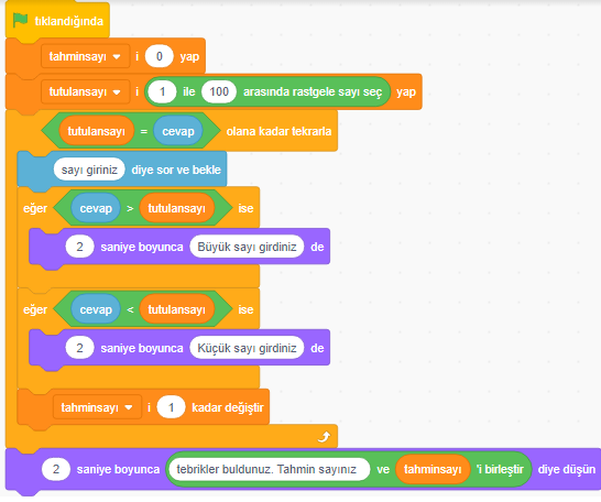 Yeşil bayrak tıklandığında kukla 1 ile 100 arasında bir sayı tutacak ve tahmin sayınızı sonuç olarak verecek sayı tahmin oyunu kodlarını yazalım.