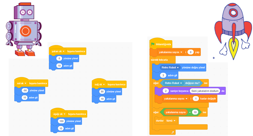 Yön tuşları belirlendikten sonra bu blokların altına Hareket dizisinden “derece yönüne yönel” bloğunu ekleyelim.